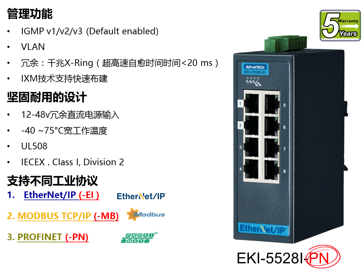 在整套研華PPC-3120S+Webaccess/HMI + 協(xié)議交換機(jī)+協(xié)議網(wǎng)關(guān)的方案中,通過(guò)增加IE瀏覽器功能的客制化HMI軟件,PPC-3120S除了可以與PLC做通訊操作界面顯示外,也讓客戶實(shí)現(xiàn)可以通過(guò)IE在PPC-3120S上直接查看后臺(tái)服務(wù)器運(yùn)行的MES 系統(tǒng)數(shù)據(jù)以及工位操作SOP。完美解決了將顯示當(dāng)前工位作業(yè)SOP的顯示器與HMI界面進(jìn)行整合需求,節(jié)約了客戶硬件成本同時(shí)實(shí)現(xiàn)工位空間布局優(yōu)化。 ▌▌相關(guān)產(chǎn)品EKI-5500/5600系列交換機(jī)