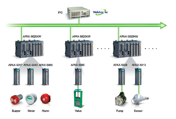 ▌▌系統(tǒng)總覽: 為了滿足Easy Control Technology的要求,研華為APAX-5620KW可編程自動化控制器(PAC)提供了各種APAX數(shù)字和模擬I / O模塊(包括APAX-5040,APAX-5060,APAX-5017和APAX- 5028),以建立一個冗余的系統(tǒng)架構(gòu)來監(jiān)控電閘和除砂設(shè)備。相同的配置還用于監(jiān)視電源系統(tǒng)中的發(fā)電機(jī)和配電面板。五個帶有APAX-5013 8通道RTD模塊的APAX產(chǎn)品可采集數(shù)據(jù)并控制泵,壓力,水位,流量,電動蝶閥等。對于這三個區(qū)域的數(shù)據(jù)采集和現(xiàn)場控制,核心是APAX- 5620KW控制器。其雙CPU模塊架構(gòu)獨(dú)立運(yùn)行,可提供高性能計(jì)算并執(zhí)行輸入和輸出控制任務(wù)。此外,冗余機(jī)制將I / O處理程序存儲在兩個獨(dú)立系統(tǒng)中的兩個控制器上。主控制器執(zhí)行I / O操作,當(dāng)主控制器發(fā)生故障時,備用控制器將自動快速接管。這種獨(dú)特的雙控制器架構(gòu)為穩(wěn)定且不間斷的應(yīng)用提供了出色的可靠性。在建筑物的中央控制室中安裝了ATX主板AIMB-781,可機(jī)架安裝的ACP-4000機(jī)箱和研華WebAccess HMI / SCADA軟件。其易于使用的用戶界面為管理人員提供了動態(tài)圖形顯示和實(shí)時數(shù)據(jù)控制?;跒g覽器的軟件還允許地方和中央政府部門隨時遠(yuǎn)程監(jiān)視水產(chǎn)養(yǎng)殖生產(chǎn)區(qū)的狀況。此外,研華還提供了支持簡單網(wǎng)絡(luò)管理協(xié)議(SNMP)的EKI-4654R和EKI-7659C工業(yè)級交換機(jī)。通過這些高性能的以太網(wǎng)交換機(jī),該項(xiàng)目的現(xiàn)場硬件設(shè)備與控制室監(jiān)控系統(tǒng)無縫連接,以確保傳輸質(zhì)量。