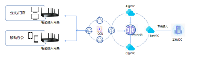 智能接入網(wǎng)關(guān)可以將機(jī)構(gòu)(IDC/分支機(jī)構(gòu)/門店等)接入數(shù)據(jù)中心,利用云上資源進(jìn)行彈性伸縮,輕松構(gòu)建混合云。
