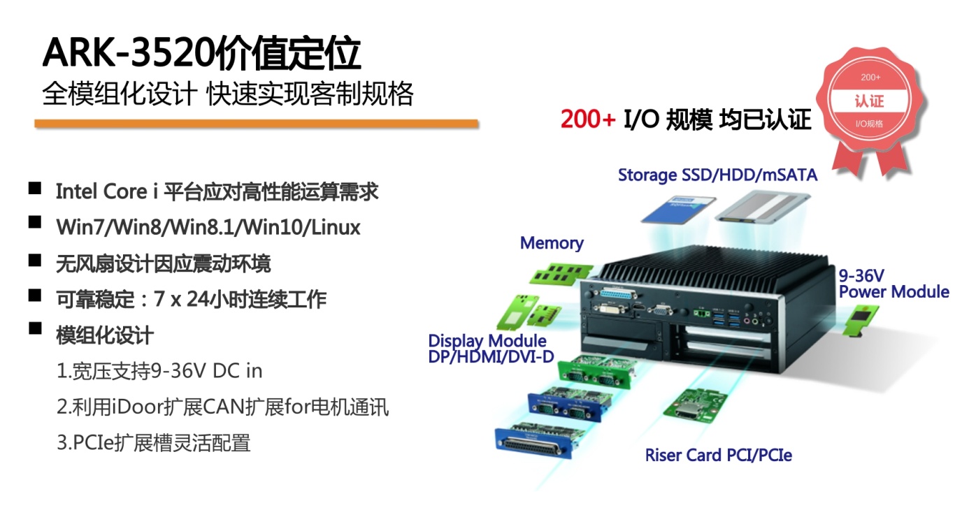![]() 研華嵌入式無風扇工控機,采用模組化設計,將功能模塊做選配設計,因對各客戶需求做或簡或繁的規(guī)格配置,ARK-3520此單一機種可以達到200多種規(guī)格,且全部認證,以便快速打造客戶方案。針對AGV內(nèi)部供電不穩(wěn)定,ARK-3520還增設寬壓模塊,規(guī)格9-36V,基本可以覆蓋絕大多數(shù)工業(yè)場景應用;透過IDoor擴展CAN BUS,以連接電機;還有靈活的PCI(e)擴展槽,以連接運動控制卡,如有需要請致電聯(lián)系我們 以上案例來自研華官網(wǎng)